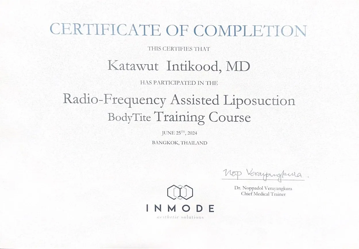 Certificate of Completion in Radio - Frequency Assisted Liposuction BodyTite Training Course by INMODE, Bangkok, Thailand