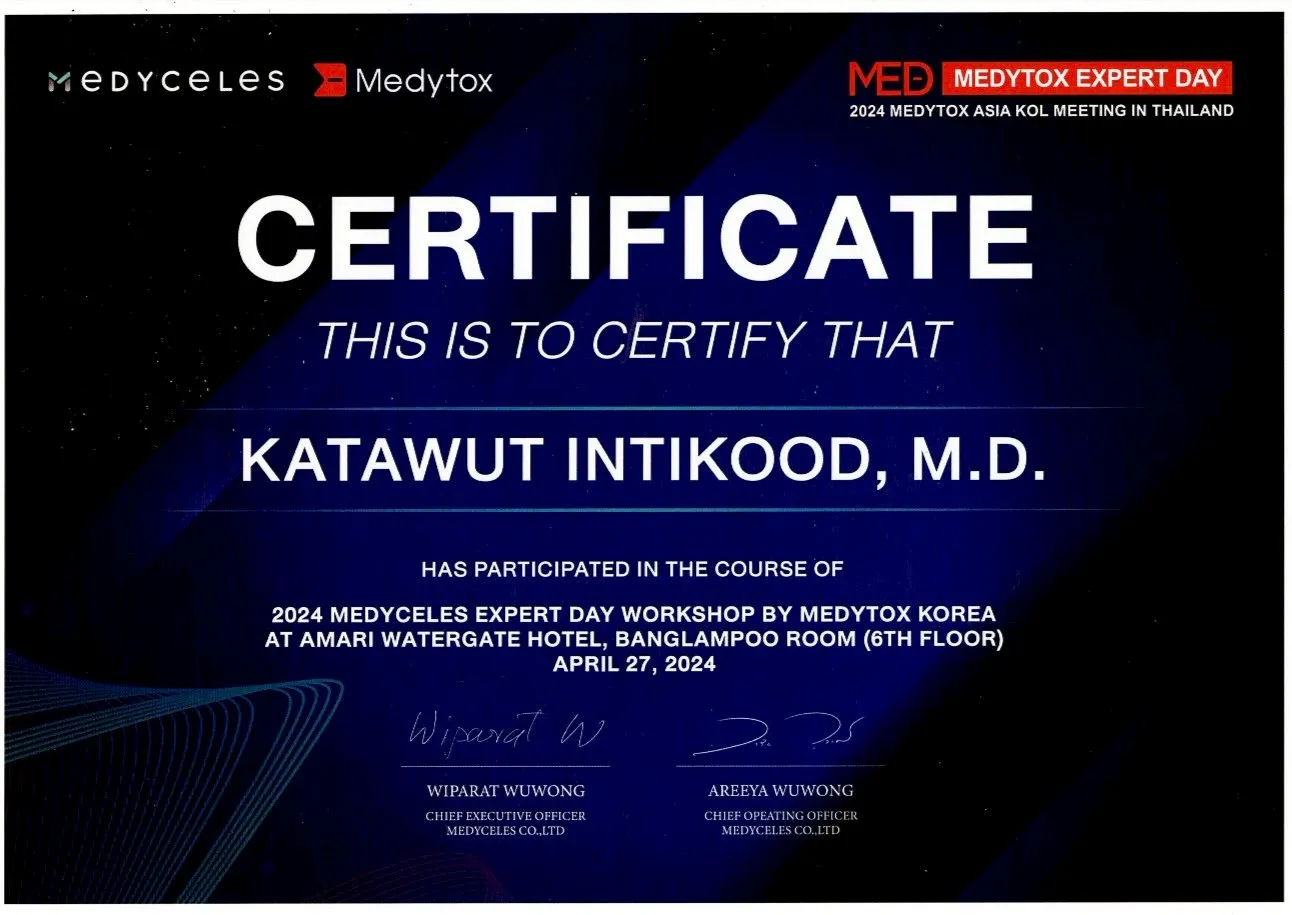 Certificate of Attendance in Lecture & Hand-on Cadaver workshop in Topic Aestox Advance Facial Aesthetic, King Chulalongkorn Memorial Hospital, Bangkok, Thailand
