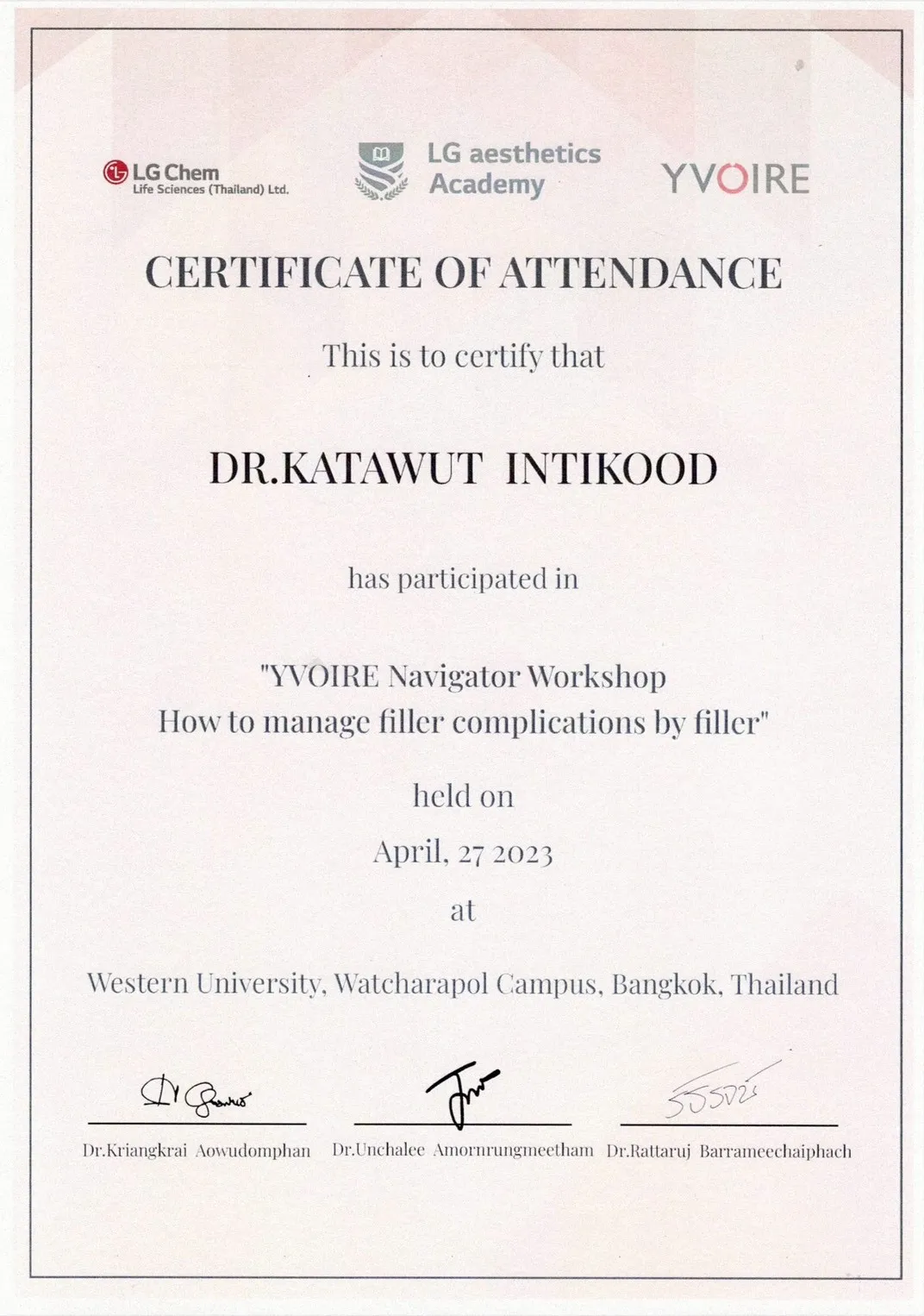 Certificate of Attendance in Lecture & Hand-on in Yvoire Navigator Workshop for How to manage Filler Complication by Filler, Western University, Bangkok, Thailand
