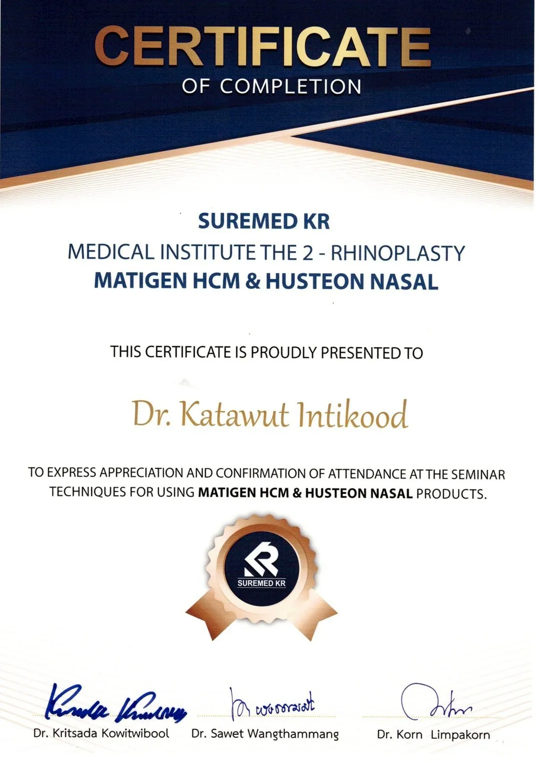 Certificate of Attendance in Rhinoplasty, Matigen HCM & Husteon Nasal, Bangkok, Thailand