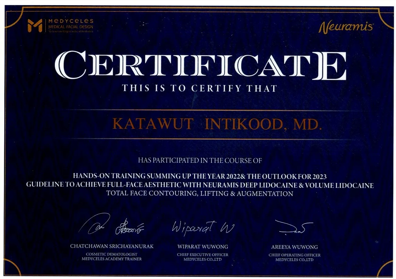 Certificate of Attendance in Lecture & Hand-on in Guideline to Achieve Full-Face Aesthetic with Neuramis Deep Lidocaine & Volume Lidocaine for Total Face Contouring, Lifting & Augmentation, Wansiri Hospital, Bangkok, Thailand